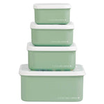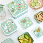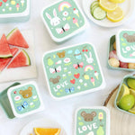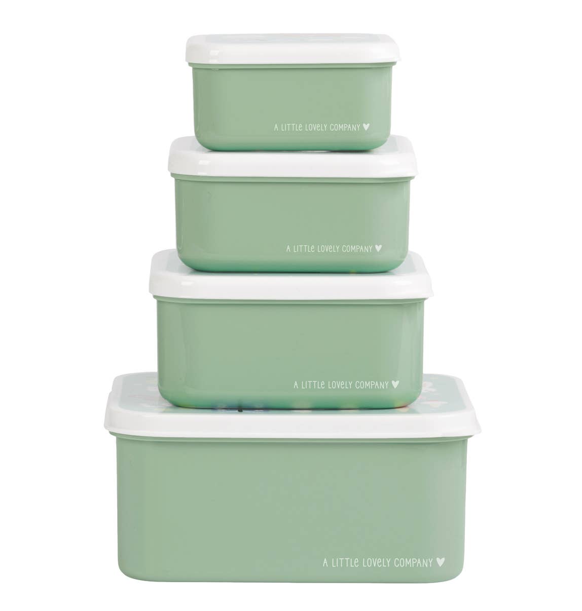 Set of four lunch and snack boxes in different sizes and matching designs.