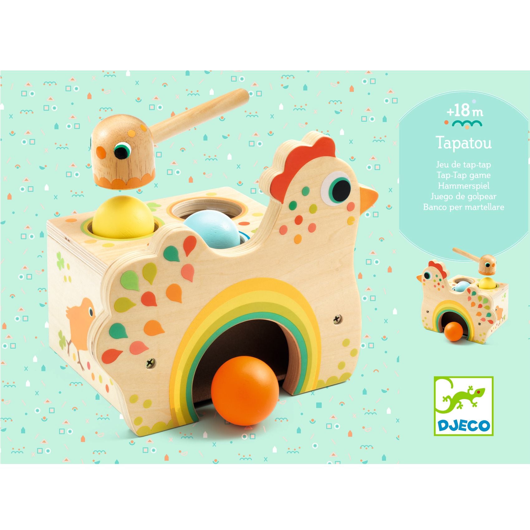A natural wood hammering game in bright colours. A beautiful hen-shaped box on which children place the 3 coloured balls over the holes and hit them with the hammer to make them fall through the holes.
