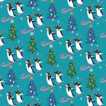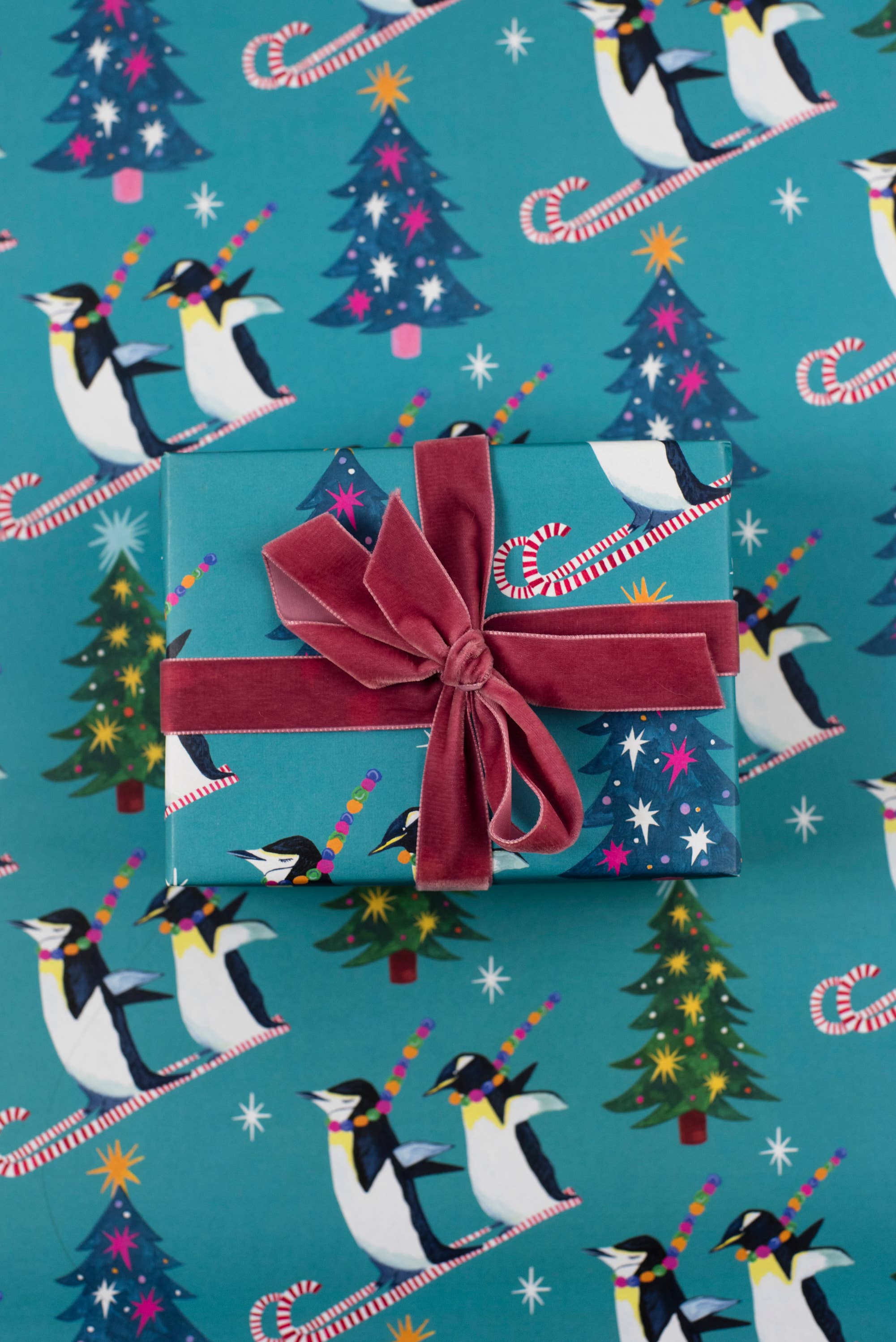 These captivating penguins are racing on their candy cane skies through an enchanting Christmas forest. This luxury wrapping paper is sure to delight all members of the family and look gorgeous nestled under the tree.