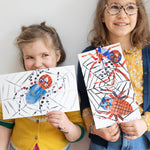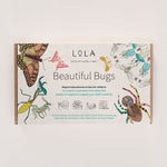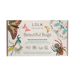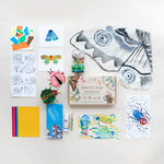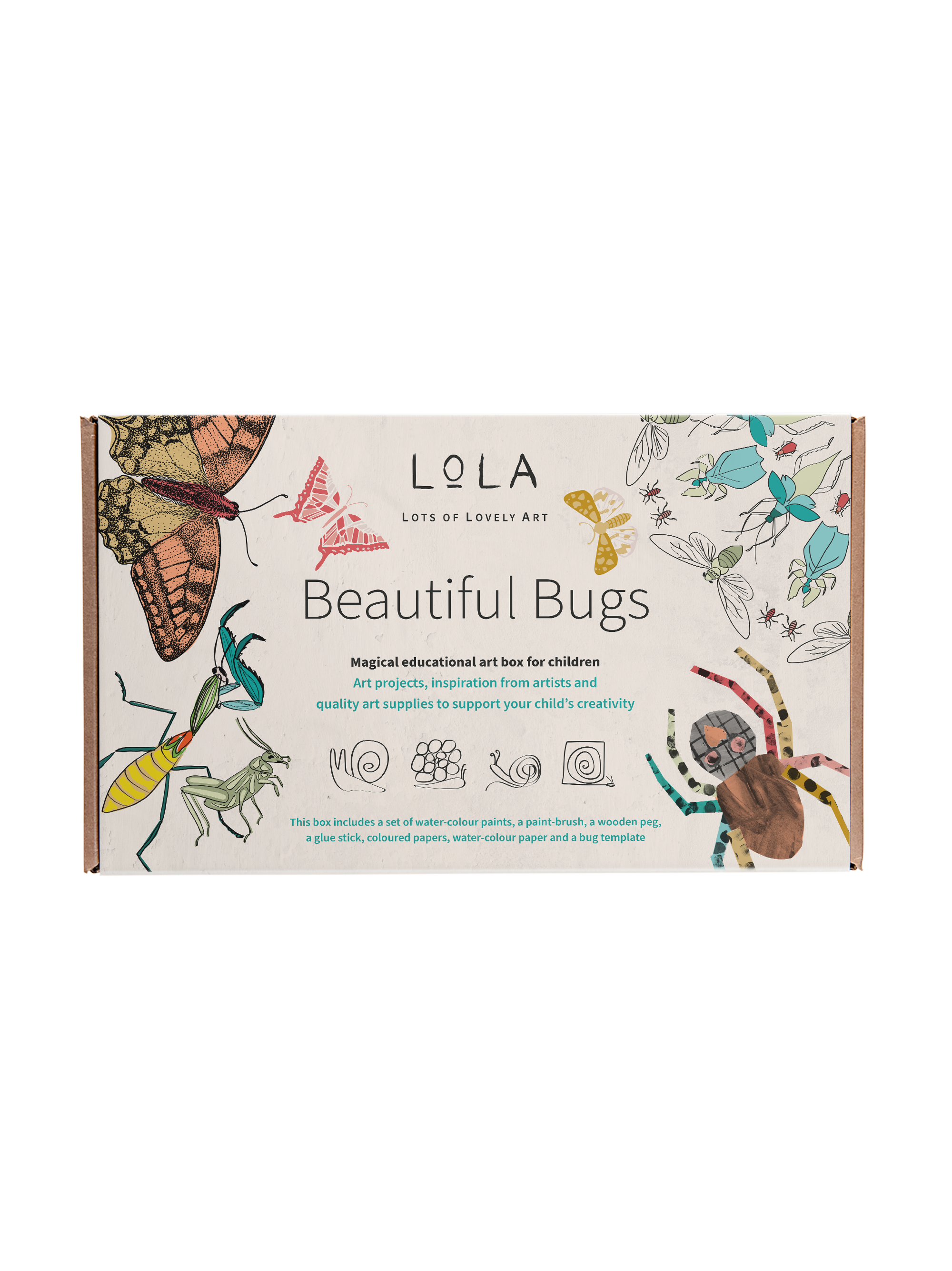 This box includes a set of water-colour paints, a paint-brush, a wooden peg, a glue stick, coloured papers, water-colour paper and a bug template