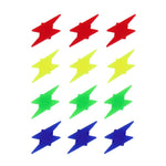A set of 12 lightning bolt shaped decorations that can be attached to the spokes of a child's bike to add some colour and flair.