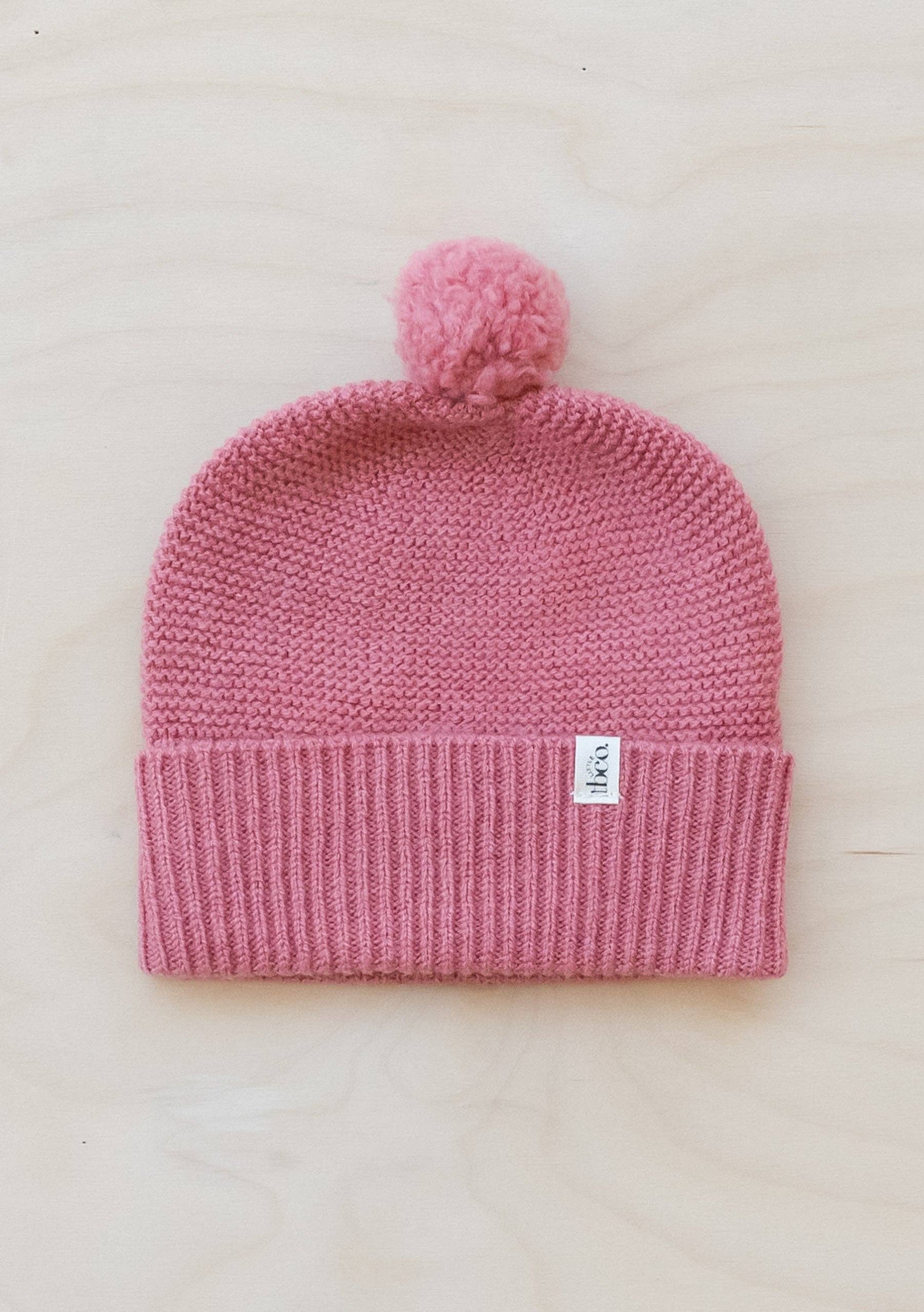 A baby beanie just blooming with colour. Woven from naturally insulating merino wool, this rose hat adds a touch of colour and a lot warmth.